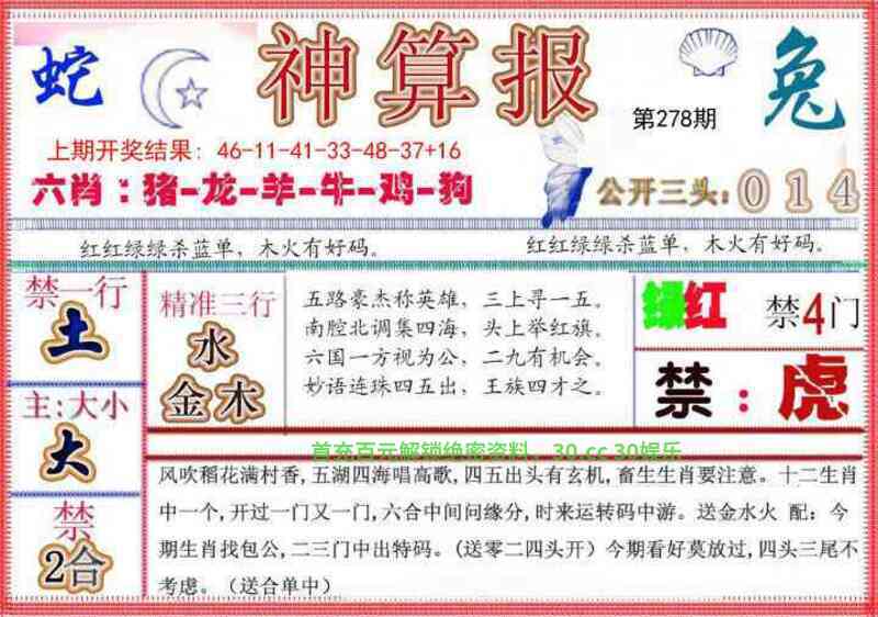 278期:七肖【龙兔鸡牛狗猴蛇】开:虎28错 |
