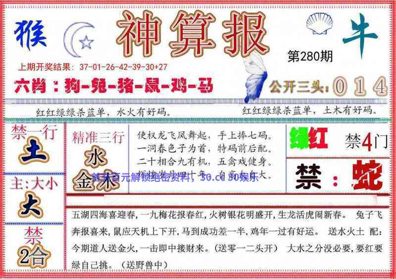 280期:七肖【羊鸡鼠猴兔马牛】开:鼠42准 |